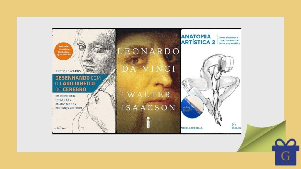 Livros são ótimos aliados no processo criativo. Existem diversas opções voltadas para técnicas de desenho (anatomia, perspectiva, sombreamento), além de títulos que exploram criatividade, inspiração e história da arte. Presentear com um livro é investir no crescimento artístico da pessoa.