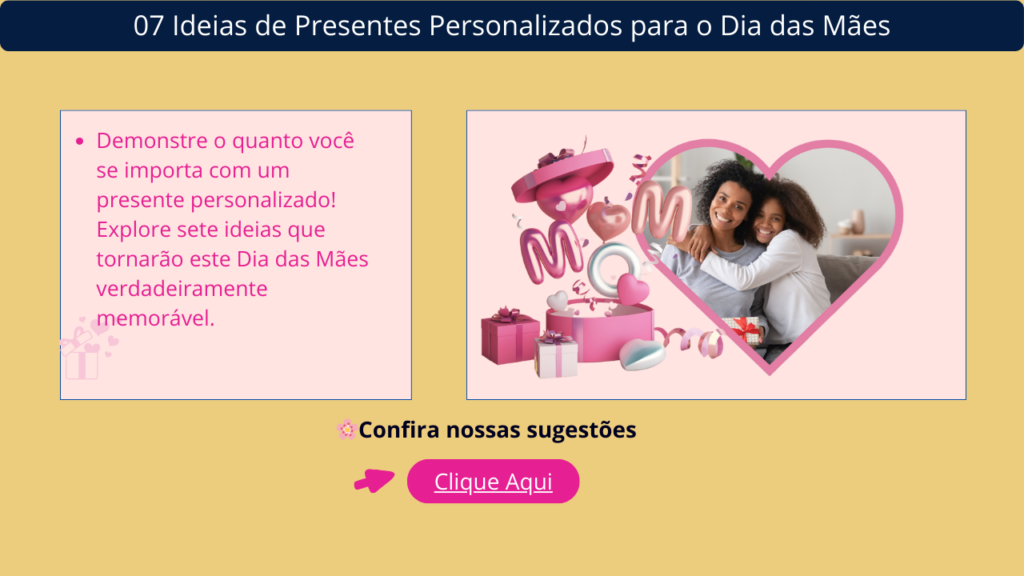🌸 Variedade – Cada mãe é única — e nossa seleção também! Reunimos opções que vão do clássico ao criativo, do sofisticado ao simples e cheio de afeto. Encontre desde itens úteis do dia a dia até aqueles que são puro carinho em forma de presente.